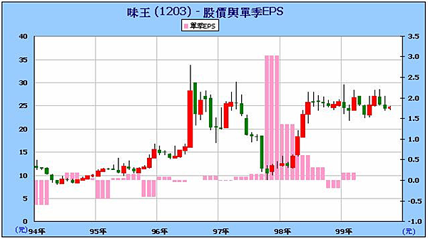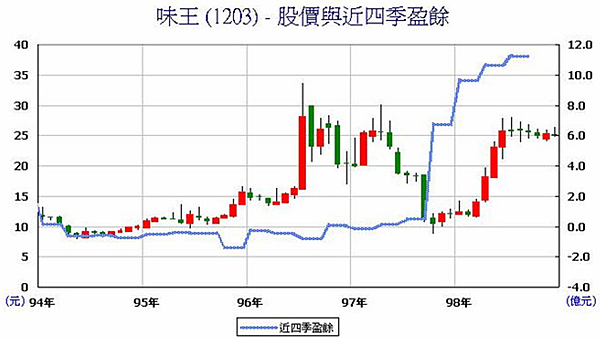 我們在97年年底跟98年年初的時候,發現了一件事,它的營收大幅的增加,到底是怎麼一回事呢?大幅增加以後又降下來,看起來這營收可能不是一個經常性的營收,在97年年底的時候,它的每股盈餘大幅上漲,這種獲利創新高的狀況下,很容易造成大家對他的期待,又發現這是營收,看起來好像是經常性的盈餘,可是在98年的時候,它的年報是4月份才會公布,1月、2月、3月、4月年報公布盈餘創新高的時候,股價果然有上去,突破20塊,最後漲到大約25塊,但經過一季兩季的增加後,盈餘就持穩了,所以我們在分析近4季盈餘的時候是相當不錯,但是還要進一步分析: