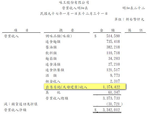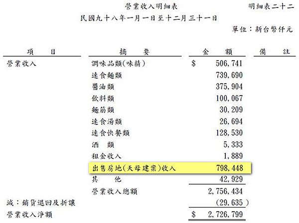 發現在97年底的時候他有出售房地(天母建案)的收入,這天母建案是營業收入,而不是出售資產,這只要幫經營的項目改一下,改成賣調味品、速食麵及不動產,立刻這就不叫處分資產而叫營業收入了。在97年的時候它的出售房地有13億7千萬,占了全公司營收40%左右,它的營業收入看起來就相當多了,可是再看一下98年: