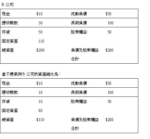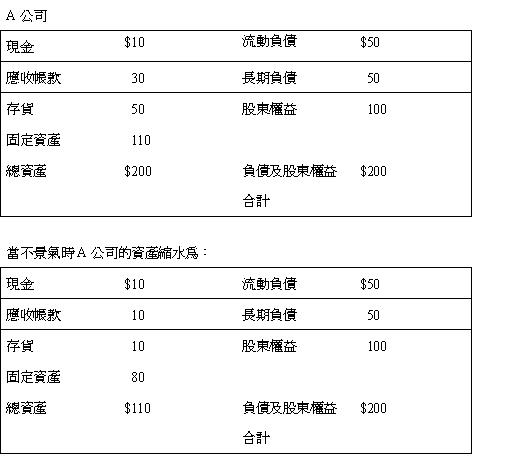 企業的營運長期而言不確定性會增加,當公司遭受長期不景氣或重大危機時,營業額下降會使公司產生很大的損失,即所謂的資產縮水(虧錢),以A、B公司之例子說明之,當A、B公司因不景氣而導致總資產縮水為$110時,發現A公司的總資產$110可以去支付負債$100,但B公司的總資產$110卻不可以去支付負債$150,所以B公司會有倒閉的危機。