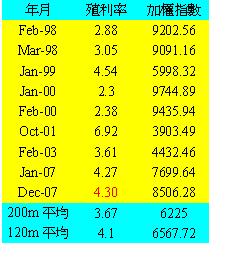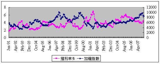 以上圖來看,在殖利率與加權指數的走勢成相反的走勢,相對於股價淨值比,殖利率較能解釋市場的相對高低點,雖然2004年以後加權指數一路上升,但是以殖利率而言,仍然高於4%的水準,顯示目前的指數並沒有脫離本質。