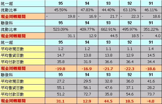 大家都知道統一超是收現金,但是實際上統一超的收款期間也是有1.1天-1.2天,很多超商宣稱如果上櫃超過一星期還賣不掉就要下櫃,結果統一超的存貨足足放個兩個星期才賣掉。以95年來說統一超要14.7天才把存貨賣掉,1.2天才把貨款收現,也就是說要16天才能收到現金(這就是營業循環的定義)。但是統一超的付款不乾脆36天才付款給廠商,所以統一超在16天收到錢後過20天候才付款。因為收款在付款之前,所以統一超不用準備週轉金,現金週轉期間是負數。問題在於統一超所收到的20天現金,並沒有保存在流動資產,而轉投入長期投資(以短支長),所以他的流動資產很少(應收帳款及存貨很少),流動負債很多(應付帳款很多),所以流動比率很差。
