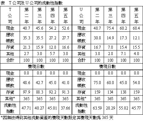 由表可得知,T公司除了第三年流動性指數低於U公司外,其餘各年均優於U公司,可見整體的衡量,T公司流動資產的變現能力比U公司為佳。