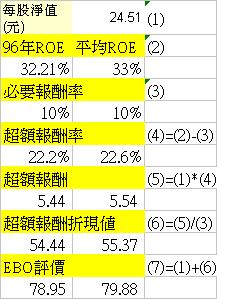 該公司的每股淨值為24.51元,其中96年的ROE與平均的ROE為32.21%及33%,必要報酬率考慮美國10年期公債殖利率及通貨膨脹率加上風險貼水定為10%,則超額報酬率分別為22.2%及22.6%,以每股淨值計算的每股超額報酬為5.44元及5.54元,以10%的折現率計算其折現值為54.44及55.37元,超額報酬的折現值加上每股淨值24.51元,其合理的評價約為78.95元及79.88元。