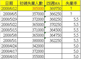 6/12初領失業人數創10週來新高,破壞了連續兩週以2000人減少的四MA趨勢。 六月份已過兩星期,如果無法迅速以每週減少17000人的話,寄望6月份的失業數字大幅改善的機率大幅降低。