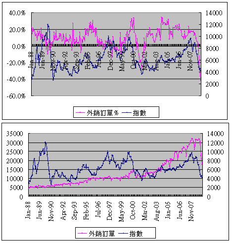 外銷訂單與台股最近幾年的關係密切,如果外銷訂單年增率大於20%,多頭的趨勢就較有保障