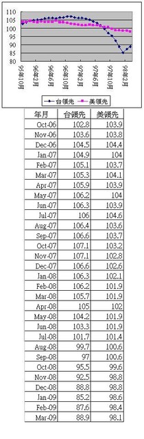 美國是一艘航空母艦,要轉彎沒那麼快。 台灣的領先指標回溫,是因為台灣的經濟跌的比美國兇,當然反彈就比較快。 台灣的領先指標起伏很大,相對的美國比較穩健。