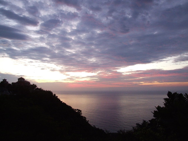 時間是清晨四點,飯店給的日出資訊是四點十五分。夫妻倆到了觀日台,居然是第一個抵達,不消五分鐘人群三三兩兩來到,皆是有備而來的攜著重裝備相機,想捕捉太陽迸出海平線最美的一霎,太陽將現的前五分鐘,紅霞滿天,彤雲片片,大自然的奧妙令人讚嘆,可惜雲層太厚,日出的霎那被雲層擋住,等看到太陽時,景色反到沒日出前幾分鐘來的迷人。