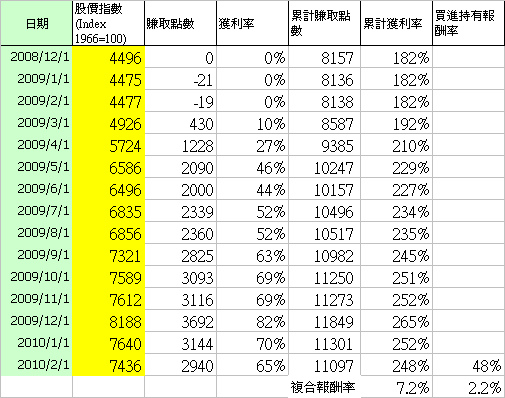 2.如果單筆,太早進去了,例如2008年7月7000點的時候進場,2009年12月出場只賺了16%。