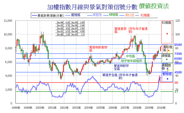 因為股市地圖是每年更新一次的,所以藍燈區與宏燈區都會再度確認,可是等到再度確認時,例如下一次確認藍燈區上修跑到6000點,那個時候一定是股價超過10000點了,也就是紅燈區由8500上修10000點,藍燈區由4500上修6000點。