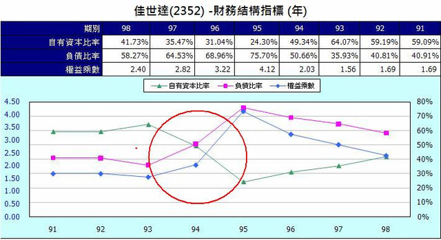 佳世達在出事情那幾年,93年到95年間,自有資本比率就由64.07%一直下滑到96年的24.3%。相對的負債比率就急速的往上拉,由35.93%增加到75.7%的水準。