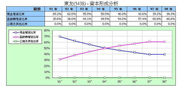 如果這家公司是跟股東要錢,由股本結構可以知道,由資本形成分析,可以看出現金增資比重逐年降低,表示自有資本的提高,股本的增加主要是靠股票股利,自己賺來的錢盈餘轉增資,並不是靠跟股東要錢作現金增資。
