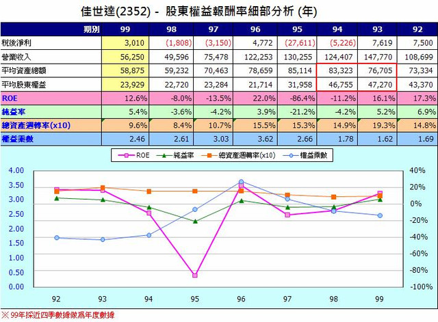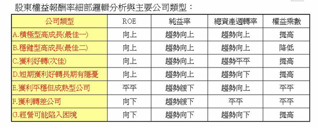 以佳世達為例,公司在94年ROE成為負數,而且總資產週轉率降低,權益乘數因為舉債由93年的1.62倍提高到94年的1.78倍,成為G型的公司。