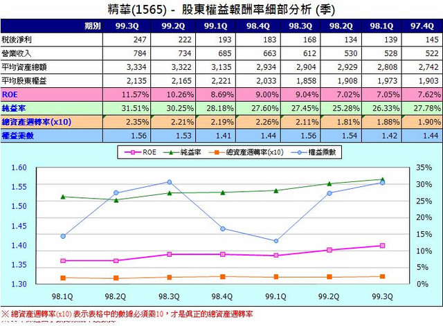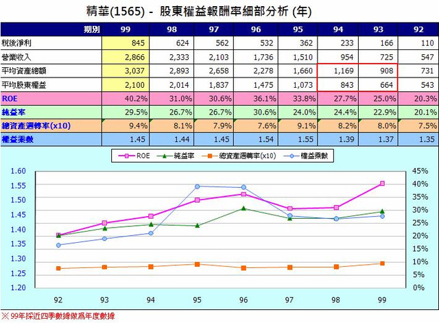 精華與佳世達不同,ROE由92年的20.3%持續提高到99年的40.2%,三大指標都有進步。純益率由92年的20.1%提高到99年的29.5%,資產週轉率由92年的0.75次提高到99年的0.94次,權益乘數也由92年的1.35倍提高到99年的1.45倍,雖然權益乘數提高,但是負債比率並不高,因為當負債比率是50%時,權益乘數是兩倍,1.45倍的權益乘數負債比率不過31%,還是相當穩健的財務結構。精華股價能夠大漲,ROE分析其屬於A級的公司,積極型高成長的公司,也是投資人願意給以高的本益比的原因之一。