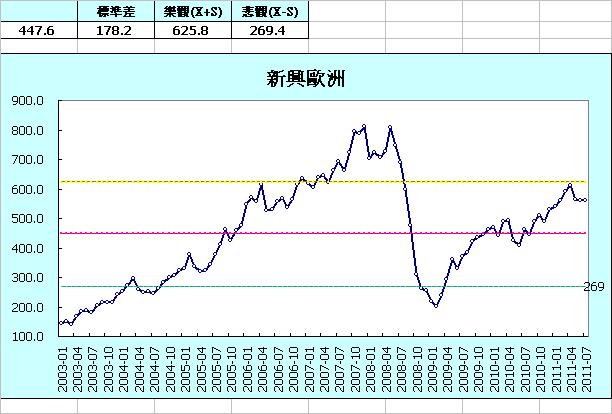 必須要分析各市場指數的相對高低點,我用過去八年的平均數加減一個標準差找出65%的指數均在269.4—625.8上。