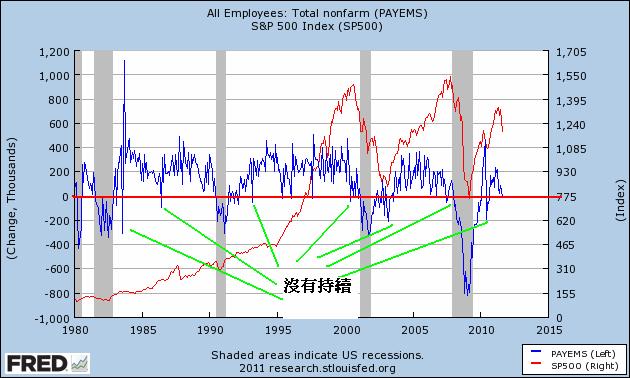 同樣的非農就業人口減少,是股市大幅下跌的原因,然而如果只是單月的數據,過去有7次股市並未下滑。