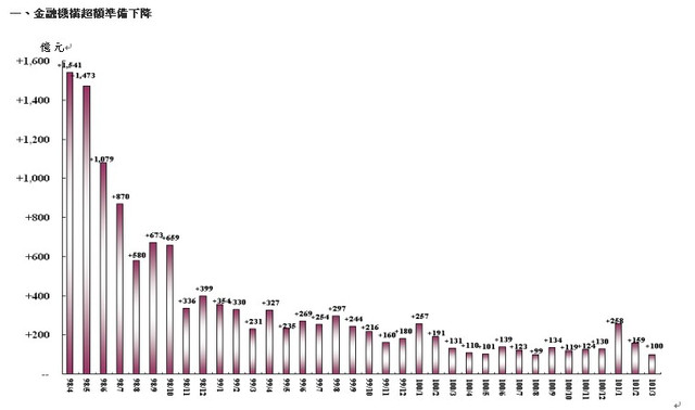 央行指出,近年來金融機構超額準備呈現大幅下降趨勢,民國98年4月時超額準備高達1,541億元,今年3月已降至100億元。官員解釋,國內超額準備下降,顯示央行一直在控制資金數量,以過去均值來看,目前的100億元算是比較合理的水位。