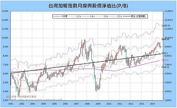 10/8 依據證交所公告103年9月的全體上市公司的股價淨值(P/B Ratio)比由上月的1.81降到1.73,本益比(P/E Ratio)比由上月的17.34下降到16.5,殖利率(Dividend Yield)由3.53%上升到3.72%。