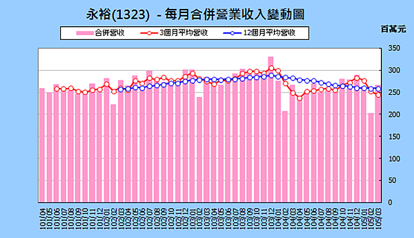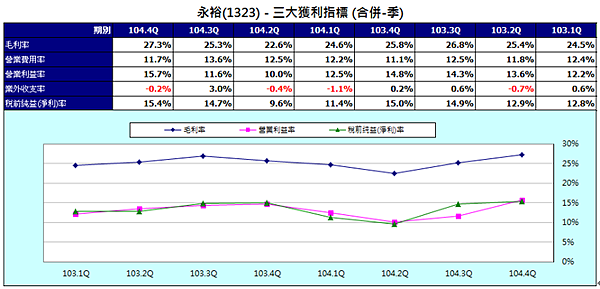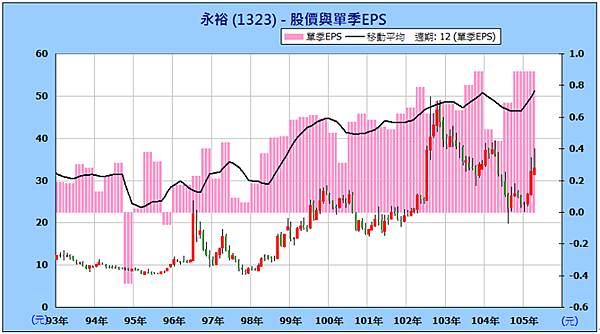 永裕公司(1323)每股盈餘由2013年第4季的0.89元跌到2014年第1季的0.52元,然後啟動了連續3季的每股盈餘年增率均負成長,股價也從降進40元跌到20元幾乎腰斬,但是2015年第四季居然回到0.89元的歷史新高,與2014年的每股盈餘持平,股價又從20元漲到37.5元,我們要確定的是,這0.89元的每股盈餘是經常還是非經常,及未來的盈餘走勢如何?