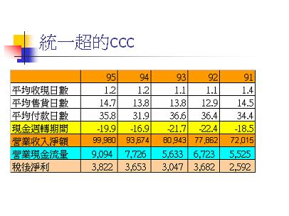 由於現金週轉期間的縮短,使7-11的營業活動的現金流量大幅增加。因為應收帳款的減少使現金流量增加,存貨的減少,也使現金流量增加,應付帳款增加,也使現金流量增加。統一超雖然平均受貨日數增加,但是平均付款期間亦延長,整體來說現金流量還是增加的。