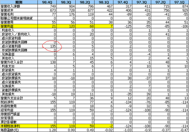 <!-- Origin Article URL: http://www.wretch.cc/blog/onewidesky/5483573 --> <a href="http://www.wretch.cc/album/show.php?i=onewidesky&b=32764&f=1405275512.jpg" target="_blank"><img src="http://pic.pimg.tw/onesky/1382296930-3801043814.jpg" border="0" alt=""/></a><br/> <br/> 看到盈餘創新高好興奮,是不是找到未來的鑽石?<br/> 這家公司超hi的,盈餘可以從-6變+4元。<br/> <br/> <a href="http://www.wretch.cc/album/show.php?i=onewidesky&b=32764&f=1405275513.jpg" target="_blank"><img src="http://pic.pimg.tw/onesky/1382296930-3556057824.jpg" border="0" alt=""/></a><br/> 看一下最近四季的盈餘,逐季提高,似忽是很好的轉機股!<br/> <a href="http://www.wretch.cc/album/show.php?i=onewidesky&b=32764&f=1405275514.jpg" target="_blank"><img src="http://pic.pimg.tw/onesky/1382296931-2923848067.jpg" border="0" alt=""/></a><br/> 確實有轉機啦!<br/> 但是主要是處分資產利得,賣掉了未來就沒了!<br/> 這家公司的非經常盈餘很不穩定,股價由2元漲到15元。<br/> 有關業績成長股,還是以經常性盈餘來判斷比較好。<br/> 財務報表分析仍然是避免踏到地雷必要的裝備。